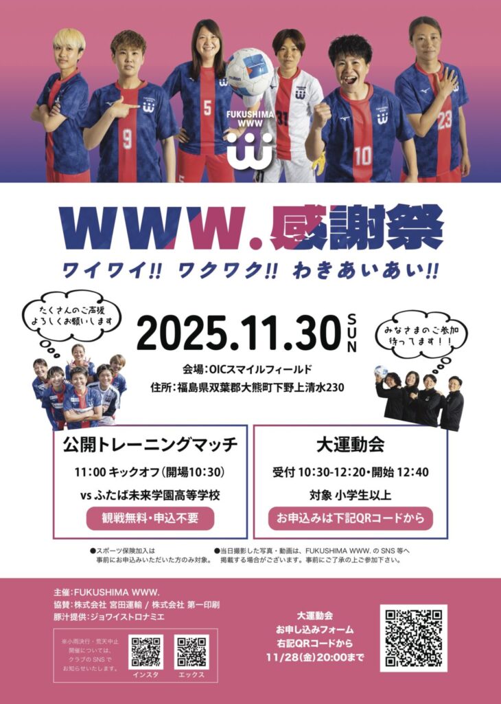 女子サッカーチーム、福島ウィーアーが、公開トレーニングマッチと大運動会を開催します。